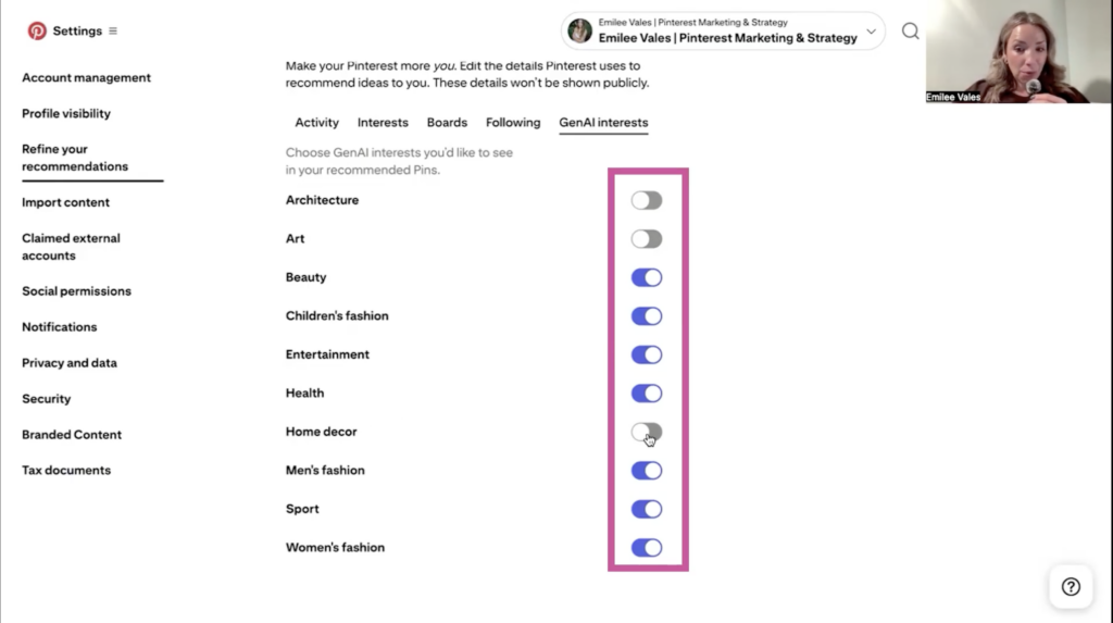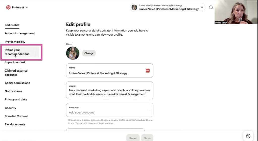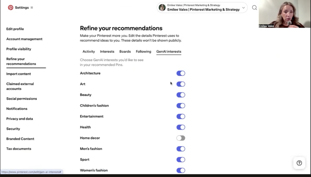 Step one, go to your Pinterest settings, and then you’re going to click on the left side, refine your recommendations.