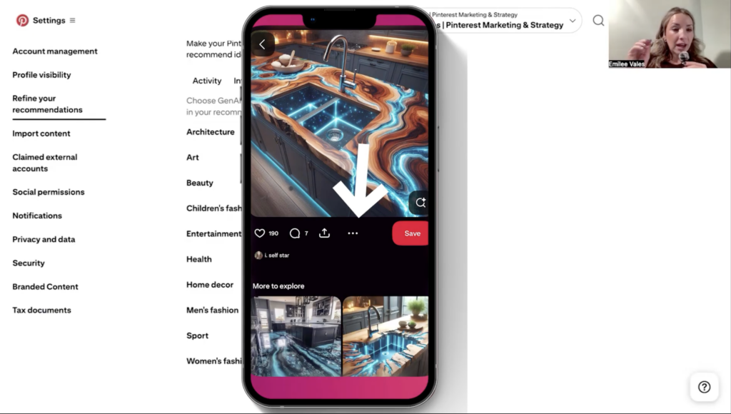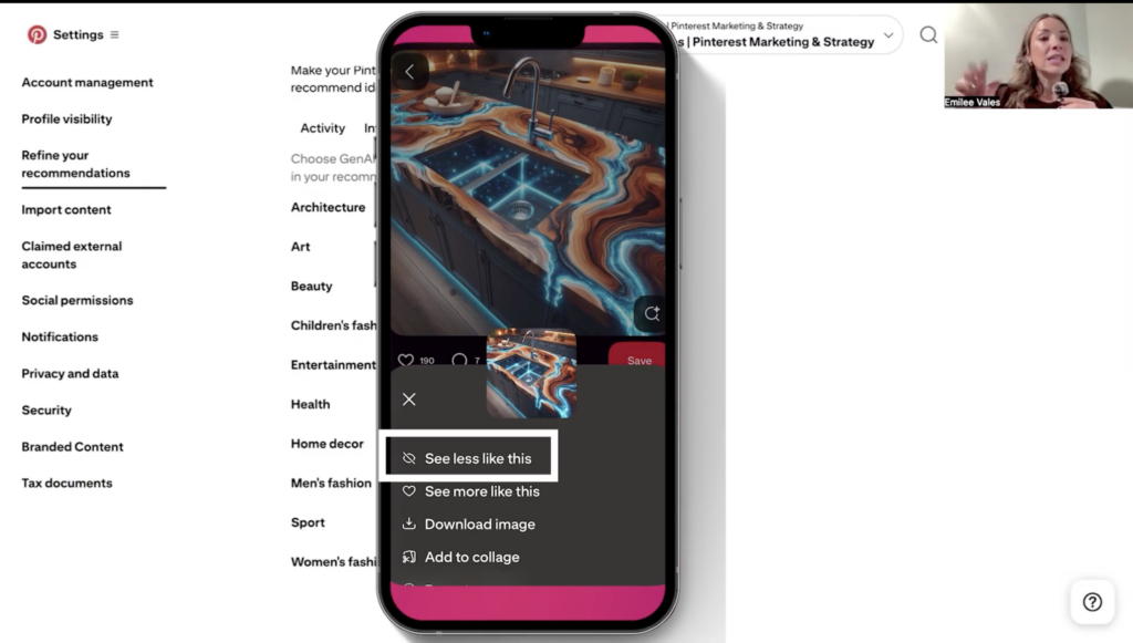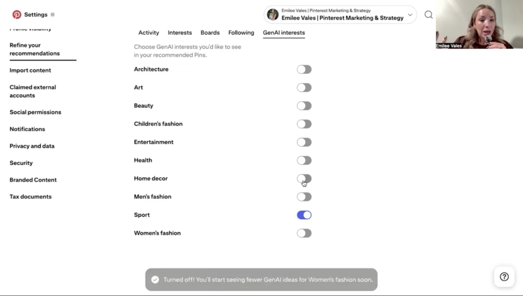 It was home decor, but it actually toggled off that Gen AI interest for home decor. So you can do this on your Pinterest app on your phone. And like I said on the pin, you’ll just click on underneath the pin image; there are three dots. You can just click on those, and I just clicked on “see less of this,” and it toggled that off. But if you decide to turn it back on, you can do that as well.